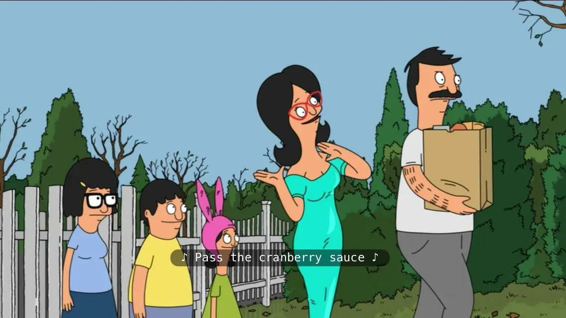 🎶 Pass the cranberry sauce, we’re having mashed potatoes Ooh, the turkey looks great Thank you for loving me Thank you for being there Thank you for loving me Everyone’s thankin' The whole world’s thankin' you Thankin' us for thankin' you Kill the turkey! 🎶